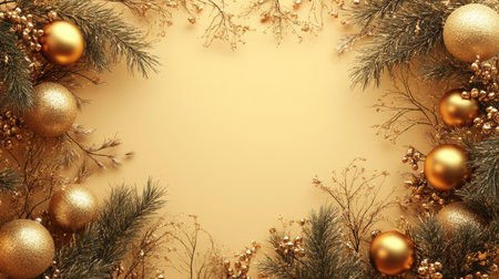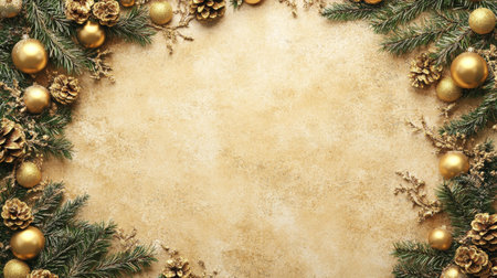 Stylish Christmas frame with natural pine textures and bright metallic decorations lining the edges.