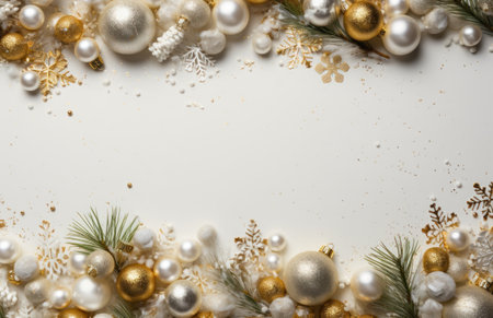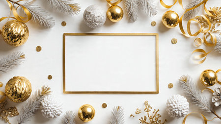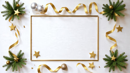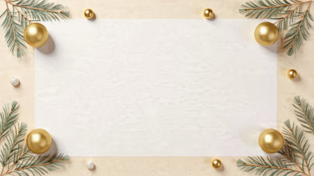 Green pine branches decorated with gold spheres and silver sparkles lining the left and right edges of a white center.