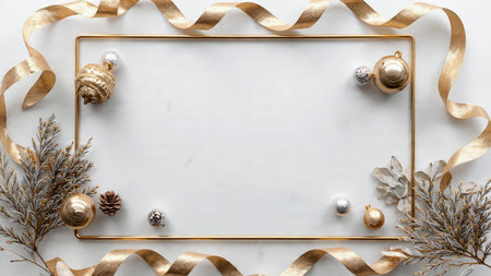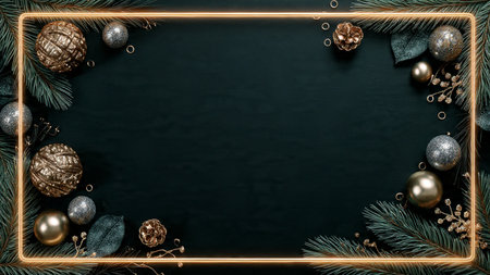 Luxurious Christmas greenery paired with metallic ornaments forming a stunning frame.