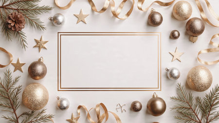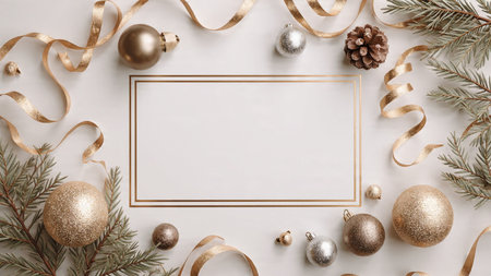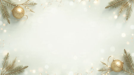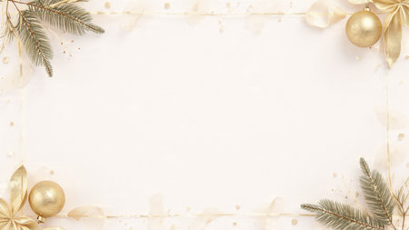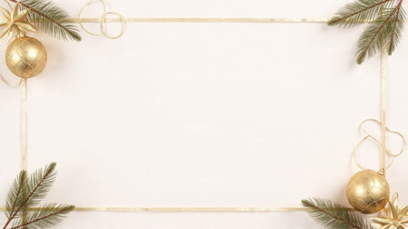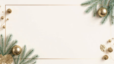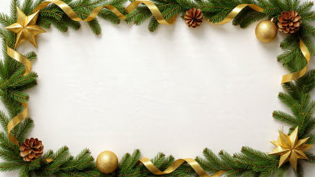 A soft, bright holiday frame enriched with pine and metallic details arranged neatly along the edges.