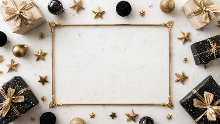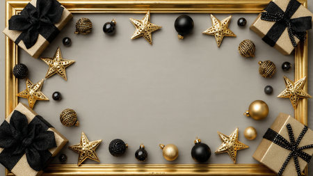 A stylish matte-black frame decorated with gold stars and high-end wrapped gifts.