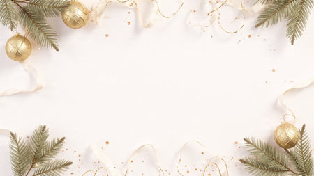 A luxurious flat lay Christmas arrangement of pine branches with Christmas decorations and ribbons in the form of a decorative frame.