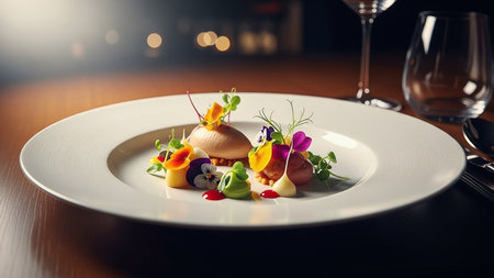 Close up to delicious gourmet dish with bokeh light. AI, Generative AI