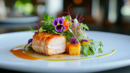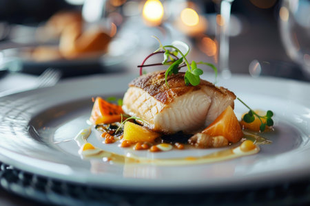 Closeup of a delectable panseared cod dish, garnished and ready to be served at a highend restaurant