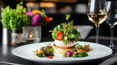 A stunning fine dining dish beautifully arranged with fresh vegetables and delicate herbs, complemented by a glass of wine, perfect for culinary lovers.