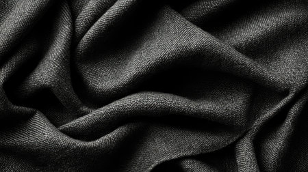 Close-up of a soft black fabric with an elegant drape showcasing rich textures and smooth folds, perfect for illustrating fashion, decor, or textile concepts.