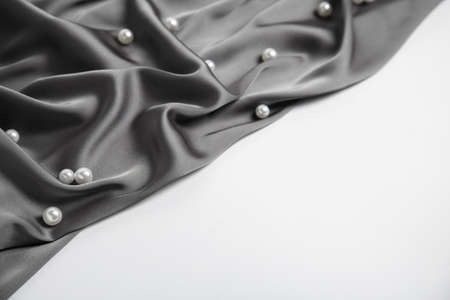 Texture of delicate black silk with pearls on white background
