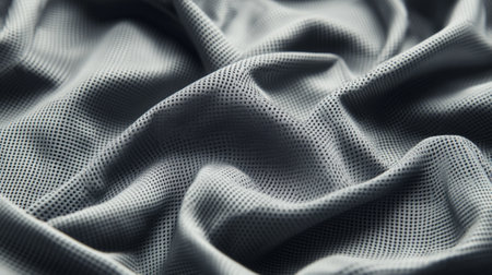 A lightweight, silver-gray fabric with small perforations for breathability. The material drapes softly with visible folds, and light reflects gently on the fine texture, emphasizing its moisture-wicking properties.
