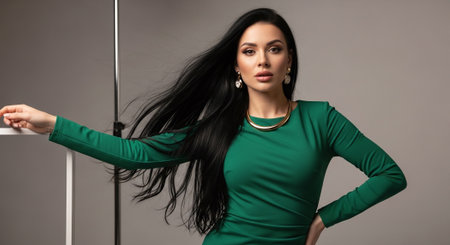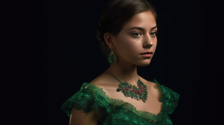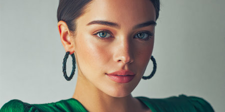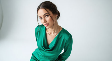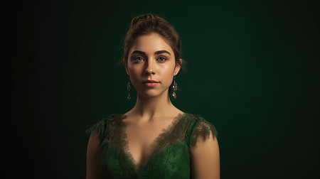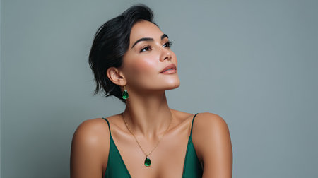 Portrait of an elegant woman in a striking green dress, showcasing beautiful jewelry, looking confidently towards the side against a minimalist backdrop.