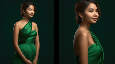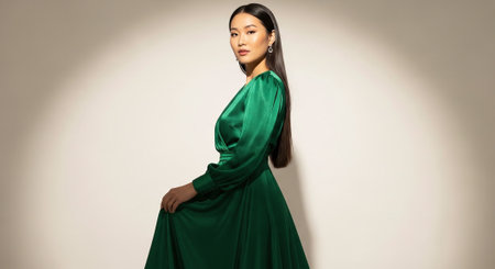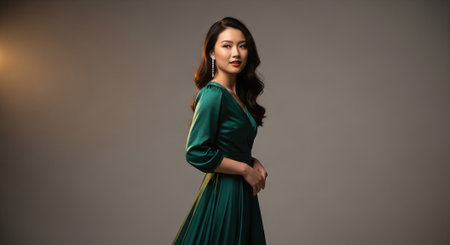 Portrait of a beautiful asian woman in green dress posing in the studio