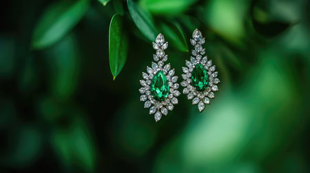 Stunning green earrings featuring exquisite gemstones surrounded by brilliant diamonds, perfectly accentuated by a lush green backdrop, ideal for special occasions.