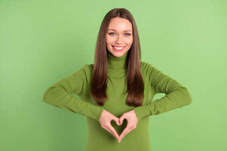 Photo portrait happy woman showing heart with fingers smiling isolated pastel green color background