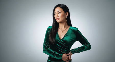 Portrait of a beautiful asian woman in green dress on grey background