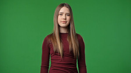 Teenage girl posing at camera smiling positive expression, isolated on chroma key green screen studio background mockup.