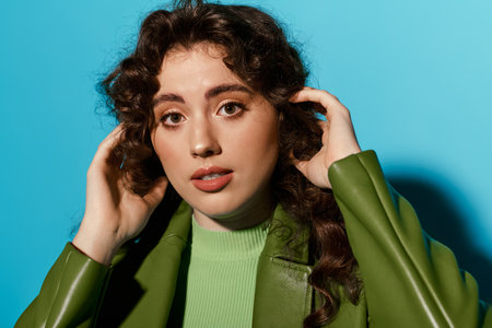 A young woman with curly hair adjusts her hair, wearing a bold green outfit in front of blue.