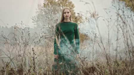 Blonde fashion model wearing long green dress posing in misty autumn field with dry vegetation and trees in background, creating evocative and stylish atmosphere