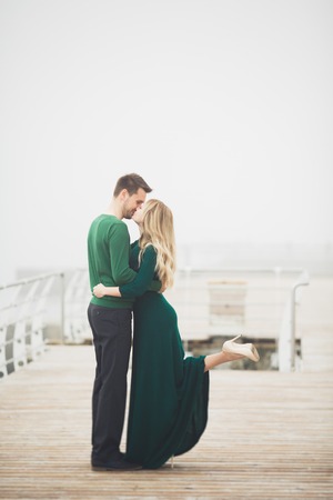 Happy couple on the pier, young family in love spending honeymoon vacation luxury islands.