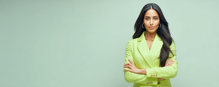 Portrait of a confident woman wearing a satin green blouse, standing with her arms crossed against a vibrant yellow background.