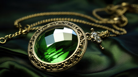 A stunning emerald pendant necklace crafted in gold rests gracefully on a shimmering green surface, ideal for showcasing elegance and luxury in jewelry design.