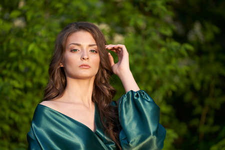 Portrait of a beautiful girl in a green silk dress on a background of green foliage. Selective focus.