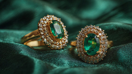 Jewelry ring with green emerald on green satin background