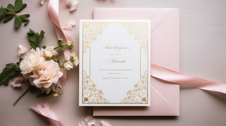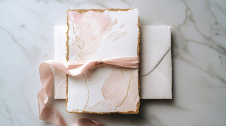 Watercolor illustration of a greeting card adorned with a pink ribbon, placed on a marble background, featuring floral patterns and textured edges for celebrations, AI generated