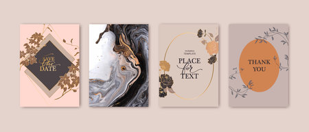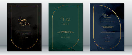 Elegant wedding stationery set featuring black, emerald green, and navy blue marble textures with refined gold frames. Includes save the date, thank you card, and dinner menu, perfect for upscale and formal celebrations.