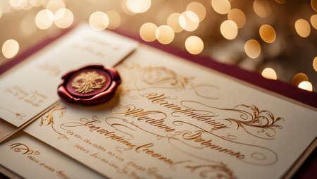 Elegant wedding invitation with a wax seal and warm bokeh lights in the background