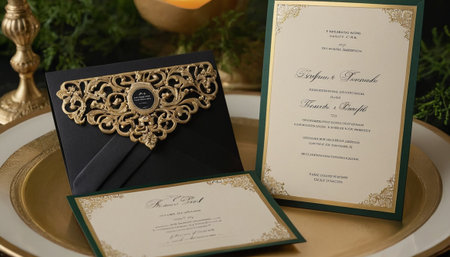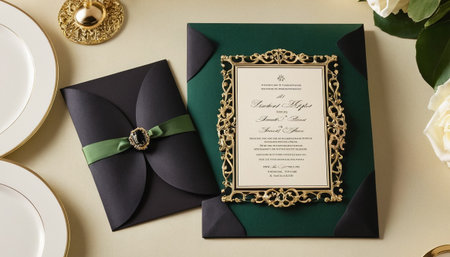 Wedding invitation flatlay featuring gold script on deep green paper, surrounded by delicate gold ribbon