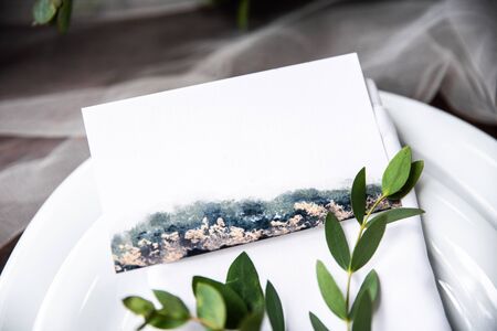 Wedding stationery set with envelope laying on a marble table decorated with eucalyptus branches and ribbons. Mock-up scene with blank paper greeting cards. Feminine close up