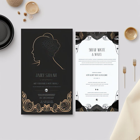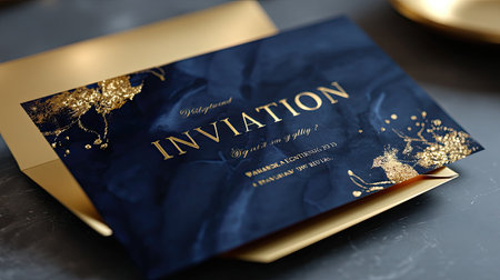 This stunning navy blue invitation features elegant gold foil accents and artistic designs, perfect for any special occasion or celebration, inviting guests with style.