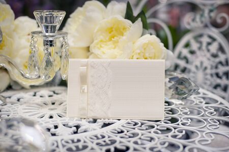 Wedding details flat lay. Wedding invitation and scroll paper. Bottle with fragrance. Simple bouquet. Ring box.