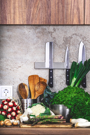 Kitchen countertop with vegetables, asparagus, cabbage and mushrooms for healthy cooking. Food background. Utensils, pans on stove, knives, bowls