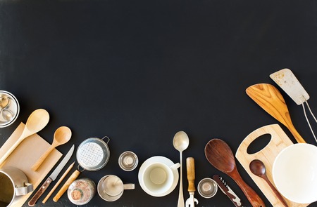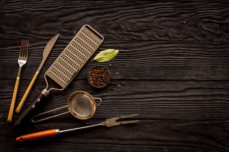 Preparation Cooking Accessories Kitchen Composition Black Table Wooden Metal Dishes Ware Different Support Stuff Top View Flat Lay