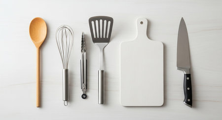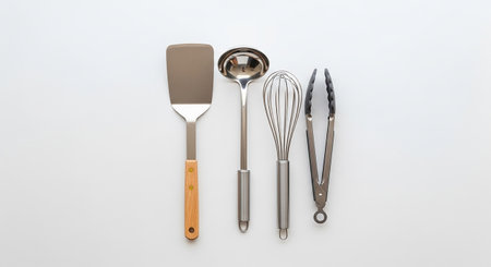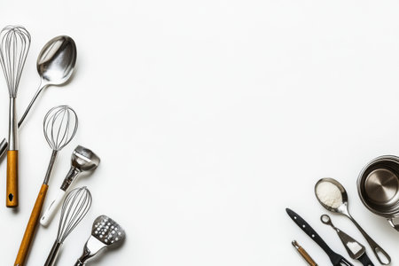 Various kitchen utensils like spatulas and whiskeys are neatly placed on a white surface, providing a clean backdrop for text or designs.