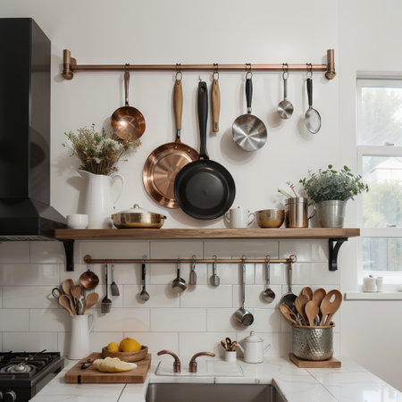 A cozy kitchen scene featuring a wooden shelf filled with various cookware and utensils. Perfect for illustrating modern culinary lifestyle and home decor.