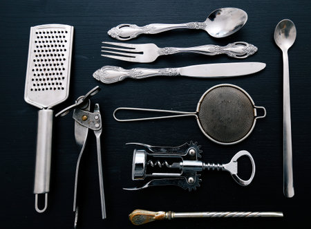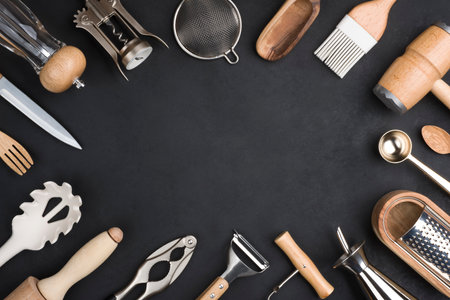 edgy flatlay of metal cooking tools against black background, created with generative ai