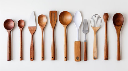 Various kitchen tools including spatulas, whiskeys, and spoons are neatly arranged on a white backdrop, perfect for culinary designs.