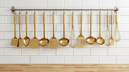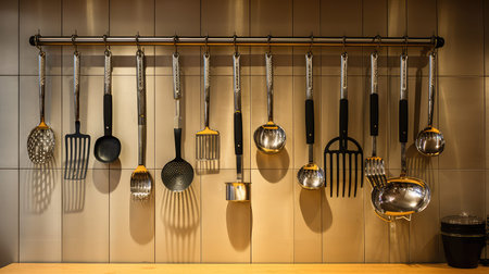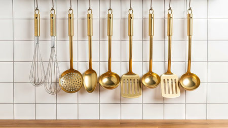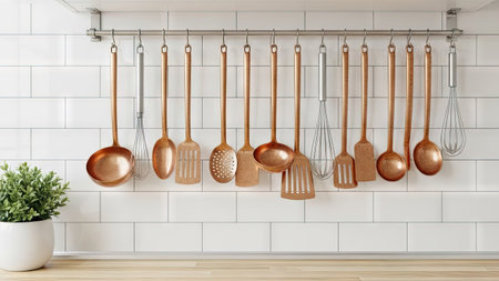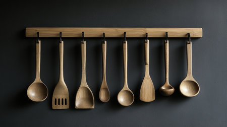 A stylish arrangement of wooden cooking utensils displayed on a wall rack. This image captures the essence of minimalist kitchen decor and functionality, ideal for culinary enthusiasts.