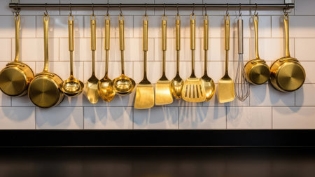 Kitchen brass utensils chef accessories Hanging copper kitchen with white tiles wall
