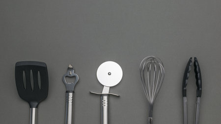 Various Kitchen Utensils on Gray Background - Spatula, Peeler, Pizza Cutter, Whisk, Tongs