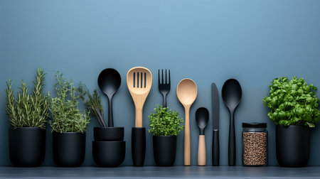 In a beautifully arranged kitchen, various wooden utensils stand prominently alongside sleek tableware, reflecting a harmonious blend of tradition and contemporary design