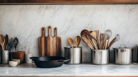 Discover a beautifully arranged kitchen setting featuring marble and wooden elements. This elegant display highlights cookware, utensils, and natural accents for a cozy vibe.