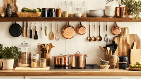 Discover a beautifully organized kitchen featuring copper cookware, wooden utensils, and glass storage jars, creating a warm and inviting culinary space.
