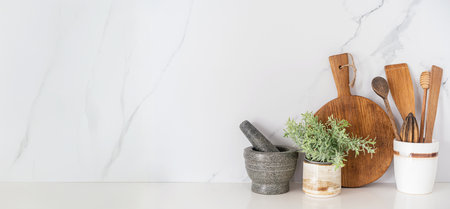 Kitchenware and utensils on a white shelf or counter. Banner with a white wall background and copy space. Kitchen cooking decor.