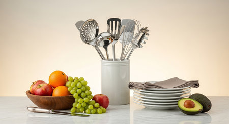 tasteful flatlay of cooking utensils on marble surface, created with generative ai
