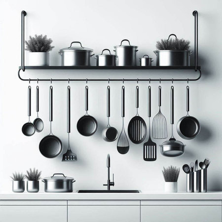 A modern kitchen scene with sleek black pots, pans, and cooking utensils hanging from a metal rack, adding a touch of sophistication to the culinary space.