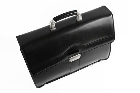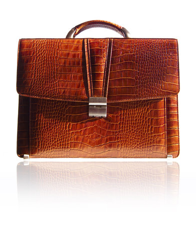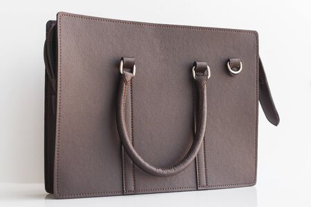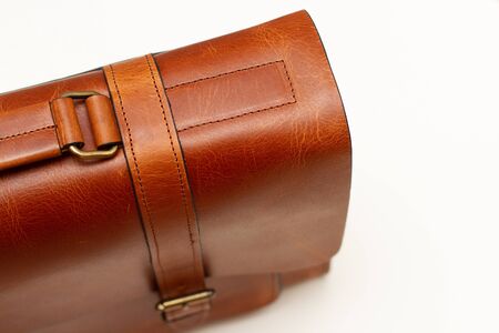brown genuine leather briefcase with metal clasps, insulated on a white background