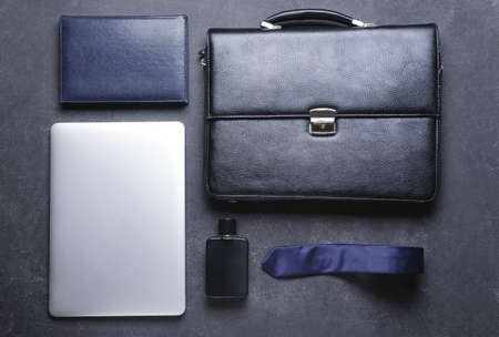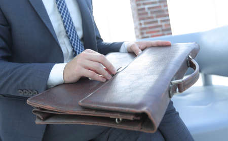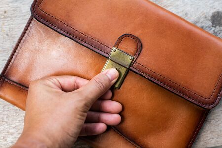 Future businessman holding, close up, leather briefcase while staying on street outdoor in city. leather bag with golden belt on gray stone background. Copy space available.