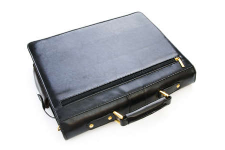Leather suitcase with notebook and purse on a white background. Business concept. Top view